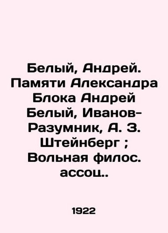 "White, Andrey. In Memory of Alexander Blok Andrey White, Ivanov-Razumnik, A. Z. Steinberg; Free Philosophy Associate./Belyy, Andrey. Pamyati Aleksandra Bloka Andrey Belyy, Ivanov-Razumnik, A. Z. Shteynberg; Volnaya filos. assots. White, Andrey. In Memory of Alexander Blok Andrey Belyi, Ivanov-Razumnik, A. Z. Steinberg; Free Philosophy Associates. St. Petersburg: 9th State Printing House, 1922. 64 p.:.We have thousands of titles and often several copies of each title may be available. Please feel free to contact us for a detailed description of the copies available. SKUbd-39ddcdbbfbf5624b."
