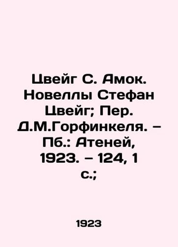 "Zweig S. Amok. Novels by Stefan Zweig; Per D. M. Gorfinkelian/Tsveyg S. Amok. Novelly Stefan Tsveyg; Per. D.M.Gorfinkelya. Pb.: Ateney, 1923. 124, 1 s.; Zweig S. Amok. Novels by Stefan Zweig; Per D. M. Gorfinkelian. We have thousands of titles and often several copies of each title may be available. Please feel free to contact us for a detailed description of the copies available. SKUbd-39fb9c7c9e861a73."