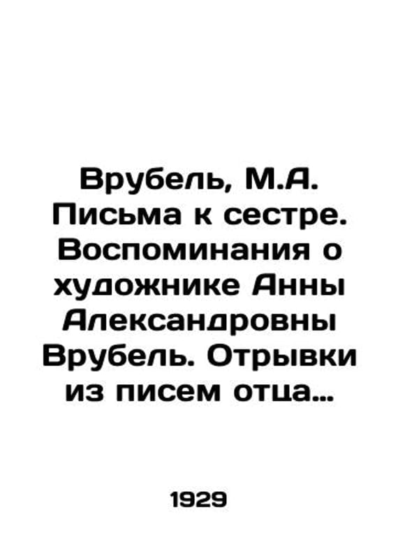 Vrubel, M.A. Letters to her sister. Memories of the artist Anna Alexandrovna Vrubel. Excerpts from letters from the artists father, the introduction of A. Ivanov./Vrubel, M.A. Pisma k sestre. Vospominaniya o khudozhnike Anny Aleksandrovny Vrubel. Otryvki iz pisem ottsa khudozhnika vstup. st. A. Ivanova. Vrubel, M.A. Letters to her sister. Memories of the artist Anna Aleksandrovna Vrubel. Excerpts from letters from the artists fathers introduction, art. A. Ivanov. We have thousands of titles and often several copies of each title may be available. Please feel free to contact us for a detailed description of the copies available. The delivery of this book might be delayed beyond the usual timeframe due to extended processing and preparation before shipment, and faster shipping options are not offered. Please inform us if you need the order by a certain date or have a deadline.SKUbd-3fc9909f7c2e858e