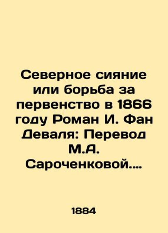 The Northern Lights or the Struggle for the Primacy in 1866, Roman I. Fan Deval: Translation by M.A. Sarochenkova. St. Petersburg Typography by V.V. Komarov, 1884/Severnoe siyanie ili borba za pervenstvo v 1866 godu Roman I. Fan Devalya: Perevod M.A. Sarochenkovoy. S.-Peterburg. Tipografiya V.V. Komarova, 1884. 2 l. il., 301 c. 22,5x15,5 sm. The Northern Lights or the Struggle for the Primacy in 1866, Roman I. Fan Deval: Translation by M.A. Sarochenkova. St. Petersburg Typography by V.V. Komarov, 1884. We have thousands of titles and often several copies of each title may be available. Please feel free to contact us for a detailed description of the copies available. SKUbd-404712bd08a9f8db.