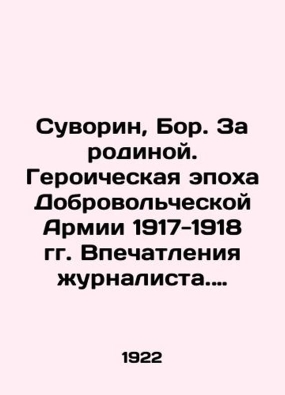 Suvorin, Bor. Behind the Motherland. The Heroic Era of the Volunteer Army 1917-1918. Impressions of a journalist. Paris, 19/Suvorin, Bor. Za rodinoy. Geroicheskaya epokha Dobrovolcheskoy Armii 1917-1918 gg. Vpechatleniya zhurnalista. Parizh, 19 Suvorin, Bor. Behind the Motherland. The Heroic Era of the Volunteer Army 1917-1918. Impressions of a journalist. Paris, 1922. 250, 1 p. 19.8 - 14.5 sm.We have thousands of titles and often several copies of each title may be available. Please feel free to contact us for a detailed description of the copies available. SKUbd-41259ec670e09084.