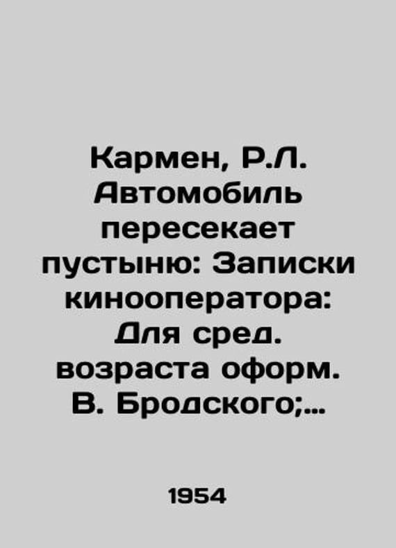 "Carmen, R.L. The car crosses the desert: Notes of the cameraman: For the middle age of the design by V.Brodsky; photo-illumination by R.L. Carmen, V.Kinelovsky, etc./Karmen, R.L. Avtomobil peresekaet pustynyu: Zapiski kinooperatora: Dlya sred. vozrasta oform. V. Brodskogo; fotoS.Pb.R. Karmena, V. Kinelovskogo i dr. Carmen, R.L. The Car Crosses the Desert: Cinematographers Notes: For Middle-Age Photographs by V. Brodsky; Photographs by R. Carmen, V. Kinelovsky, and others by M. Detgiz, 1954. We have thousands of titles and often several copies of each title may be available. Please feel free to contact us for a detailed description of the copies available. SKUbd-42bc25e5fe164ac0."