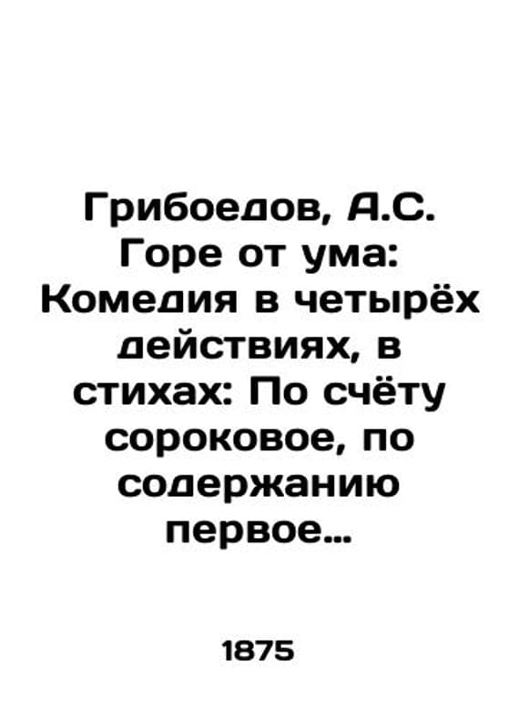 Griboyedov, A.S. Woe out of Mind: Comedy in Four Acts, in Poems: On the Fortieth Count, the first full edition./Griboedov, A.S. Gore ot uma: Komediya v chetyryokh deystviyakh, v stikhakh: Po schyotu sorokovoe, po soderzhaniyu pervoe polnoe izdanie. Griboyedov, A.S. Woe out of Mind: Comedy in Four Acts, in Poems: On the Fortieth Count, the first full edition.We have thousands of titles and often several copies of each title may be available. Please feel free to contact us for a detailed description of the copies available. SKUbd-42d125eb00c4979c.