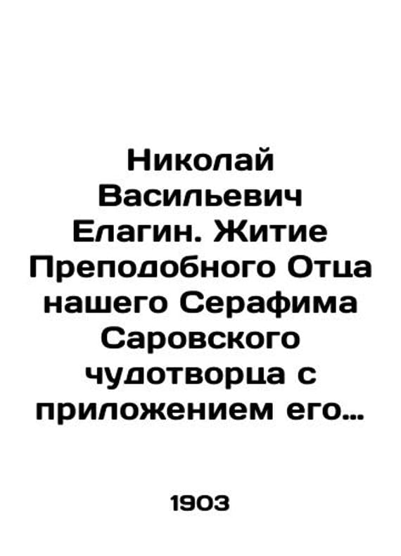Nikolai Vasilyevich Elagin. The Life of Our Venerable Father Seraphim the Miracle Worker of Sarov, with the attachment of his instructions and a cell rule with an image of Father Seraphim and a picture of his handwriting. Sixth edition. Property of the Sarov Monastery. Moscow. 1903./Nikolay Vasilevich Elagin. Zhitie Prepodobnogo Ottsa nashego Serafima Sarovskogo chudotvortsa s prilozheniem ego nastavleniy i keleynogo pravilo s izobrazheniem ottsa Serafima i snimkom ego pocherka. Shestoe izdanie. Sobstvennost Sarovskoy obiteli. Moskva. 1903. Nikolai Vasilyevich Elagin. The Life of Our Venerable Father Seraphim the Miracle Worker of Sarov, with the attachment of his instructions and a cell rule with an image of Father Seraphim and a picture of his handwriting. Sixth edition. Property of the Sarov Monastery. Moscow. 1903. We have thousands of titles and often several copies of each title may be available. Please feel free to contact us for a detailed description of the copies available. SKUbd-43d8d70c01837ec4.