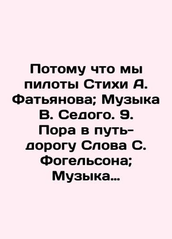 "Because we are pilots of the Poems of A. Fatyanov; Music of V. Sedogo. 9. Its Time to Go the Way of S. Fogelsons Word; Music of V. Sedogo/Potomu chto my piloty Stikhi A. Fatyanova; Muzyka V. Sedogo. 9. Pora v put-dorogu Slova S. Fogelsona; Muzyka V. Sedogo Because we are pilots of the Poems of A. Fatyanov; Music of V. Sedogo. 9. Its Time to Go the Way of S. Fogelsons Word; Music of V. Sedogo.We have thousands of titles and often several copies of each title may be available. Please feel free to contact us for a detailed description of the copies available. SKUbd-45751cd9f7a8908a."
