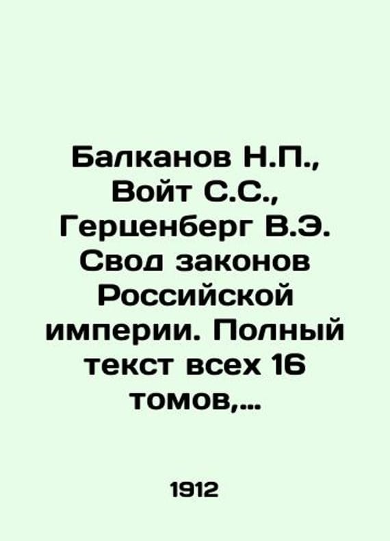 Balkanov N., Voit S.S., Herzenberg V.E. Code of the Laws of the Russian Empire. Complete text of all 16 volumes, consistent with the latest sequences, resolutions issued in accordance with Article 87 of the Basic Law, and later laws.. In 3 Vol. 1-3./Balkanov N., Voyt S.S., Gertsenberg V.E. Svod zakonov Rossiyskoy imperii. Polnyy tekst vsekh 16 tomov, soglasovannyy s poslednimi prodolzheniyami, postanovleniyami, izdannymi v poryadke st. 87 Osnovnogo zakona, i pozdneyshimi uzakoneniyami.. V 3 t. T. 1-3. Balkanov N., Voit S.S., Herzenberg V.E. Code of the Laws of the Russian Empire. The full text of all 16 volumes, coordinated with the latest sequences, resolutions issued in accordance with Article 87 of the Basic Law, and later regulations.. In 3 Vol. Vol. 1-3. St. Petersburg: The Artist, 1912-1914. Vol. 1: 16, 440, XIII vol. Vol. 2: 2, 738, XX vol. Vol. 3: 2, 404, XII, 42, 2 pp. 26 - 18,5 see. We have thousands of titles and often several copies of each title may be available. Please feel free to contact us for a detailed description of the copies available. SKUbd-45c1cb74521bedfe.