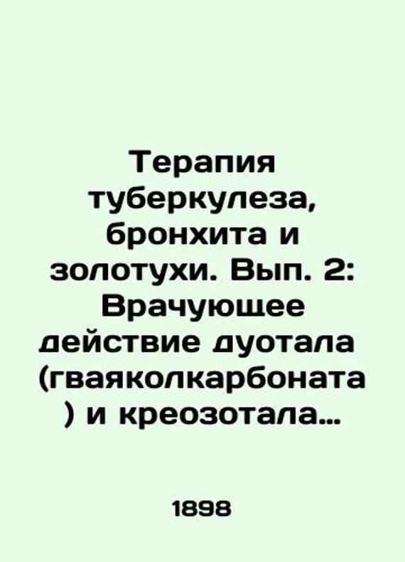 Therapy for tuberculosis, bronchitis, and gold leaf. Volume 2: The therapeutic effects of duotal (guayacolcarbonate) and creosotal (cresotcarbonate) are specific./Terapiya tuberkuleza, bronkhita i zolotukhi. Vyp. 2: Vrachuyushchee deystvie duotala (gvayakolkarbonata) i kreozotala (krezotkarbonata) est spetsificheskoe. Therapy of tuberculosis, bronchitis and golden eagle. Volume 2: The therapeutic effects of duotal (gvayakolcarbonate) and creosotcarbonate (cresotcarbonate) are specific. We have thousands of titles and often several copies of each title may be available. Please feel free to contact us for a detailed description of the copies available. SKUbd-460efcab6479b392.