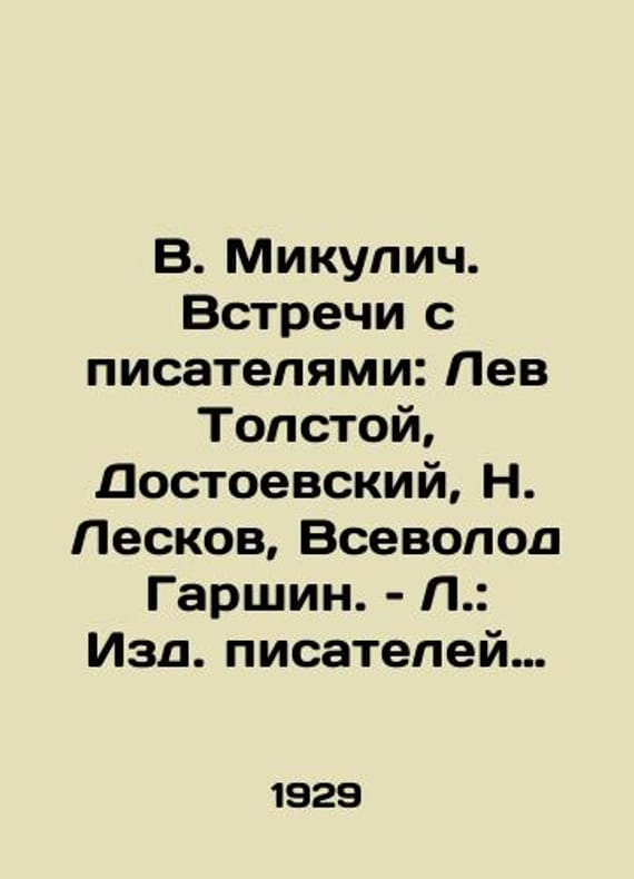 V. Mikulich. Meetings with writers: Lev Tolstoy, Dostoevsky, N. Leskov, Vsevolod Garshin/V. Mikulich. Vstrechi s pisatelyami: Lev Tolstoy, Dostoevskiy, N. Leskov, Vsevolod Garshin. L.: Izd. pisateley v Leningrade, 1929. 4, 236, 3 s. V. Mikulich. Meetings with writers: Lev Tolstoy, Dostoevsky, N. Leskov, Vsevolod Garshin. We have thousands of titles and often several copies of each title may be available. Please feel free to contact us for a detailed description of the copies available. SKUbd-46de79b57385c75.