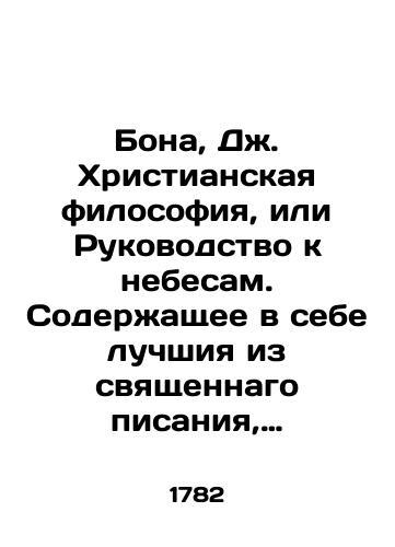 Bona, J. Christian Philosophy, or Guide to Heaven. Containing the best of scripture, holy fathers, and ancient philosophers of moral teachings, written in Latin by John Bona, Cardinal./Bona, Dzh. Khristianskaya filosofiya, ili Rukovodstvo k nebesam. Soderzhashchee v sebe luchshiya iz svyashchennago pisaniya, svyatykh ottsev i drevnikh filosofov nravoucheniya sochineno na latinskom yazyke Ioannom Bonoy, kardinalom. Christian Philosophy, or Guide to Heaven. Containing the best of the scripture, holy fathers, and ancient philosophers of moral teachings, written in Latin by John Bona, Cardinal. We have thousands of titles and often several copies of each title may be available. Please feel free to contact us for a detailed description of the copies available. SKUbd-4777674b818d3506.