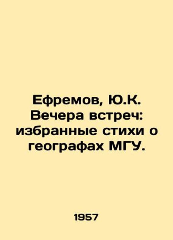 Yefremov, Y.K. Meetings evenings: Selected poems about Moscow State University geographers./Efremov, Yu.K. Vechera vstrech: izbrannye stikhi o geografakh MGU. Yefremov, Y.K. Meetings evenings: Selected poems about Moscow State University geographers. Moscow: Returned to Moscow State Universitys L.I.K., 1957. We have thousands of titles and often several copies of each title may be available. Please feel free to contact us for a detailed description of the copies available. SKUbd-48b7d704a71928ed.