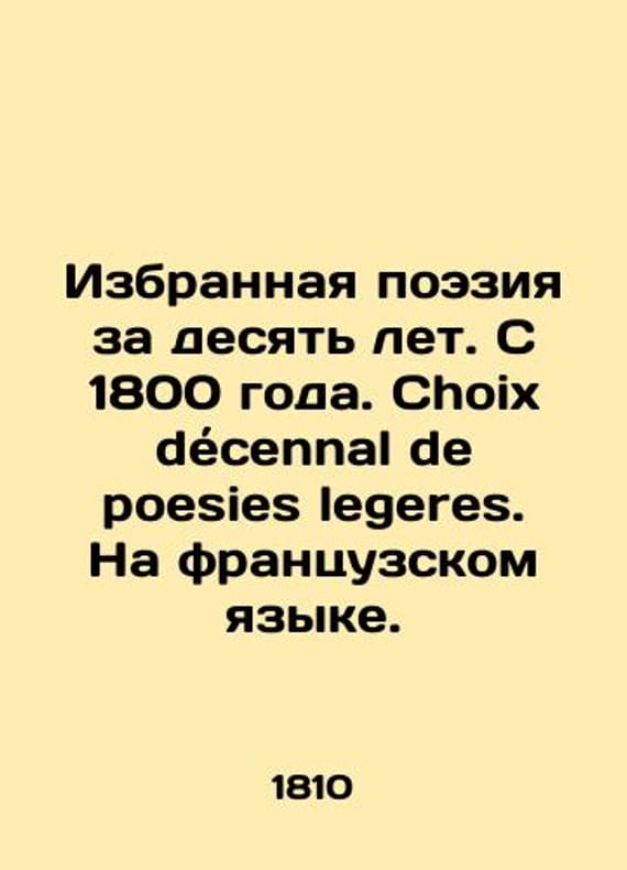 Selected Poetry in Ten Years. Since 1800. Choix decennal de poesies legeres. In French./Izbrannaya poeziya za desyat let. S 1800 goda. Choix decennal de poesies legeres. Na frantsuzskom yazyke. Selected Poetry in Ten Years. Since 1800. Choix decennal de poesies legeres. In French. Paris: Blanchard, 1810.We have thousands of titles and often several copies of each title may be available. Please feel free to contact us for a detailed description of the copies available. SKUbd-48cf693073046835.