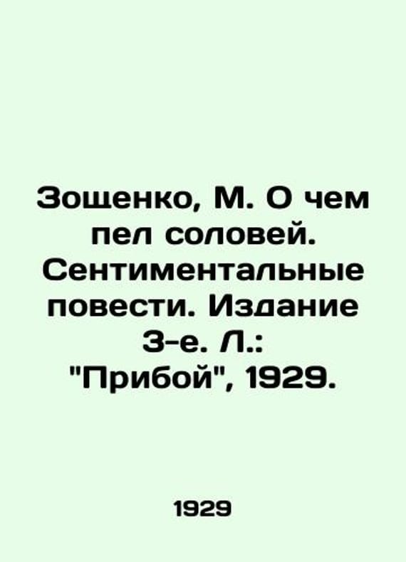 Zoshchenko, M. What the Nightingale Sang. Sentimental Stories. Edition 3, L.: Priboy, 1929./Zoshchenko, M. O chem pel solovey. Sentimentalnye povesti. Izdanie 3-e. L.: Priboy, 1929. Zoshchenko, M. What the Nightingale Sang. Sentimental Stories. Edition 3, L.: Priboy, 1929.We have thousands of titles and often several copies of each title may be available. Please feel free to contact us for a detailed description of the copies available. SKUbd-4dd1b3f3bc8d1a54.