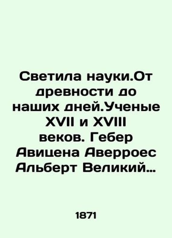 The luminaries of science. From antiquity to the present day. Seventeenth and eighteenth-century scientists. Geber Avicena Averroes Albert the Great Roger Bacon Raymond Lullius Gutenberg. M.O. Wolf. 1871./Svetila nauki.Ot drevnosti do nashikh dney.Uchenye XVII i XVIII vekov. Geber Avitsena Averroes Albert Velikiy Rozher Bakon Raymund Lyulliy Gutenberg. M.O. Volf. 1871. The luminaries of science. From antiquity to the present day. Seventeenth and eighteenth-century scientists. Geber Avicena Averroes Albert the Great Roger Bacon Raymond Lulli Gutenberg. M.O. Wolf. 1871. 558 2 p. 12 l. We have thousands of titles and often several copies of each title may be available. Please feel free to contact us for a detailed description of the copies available. SKUbd-52661b027fd8bd9f.