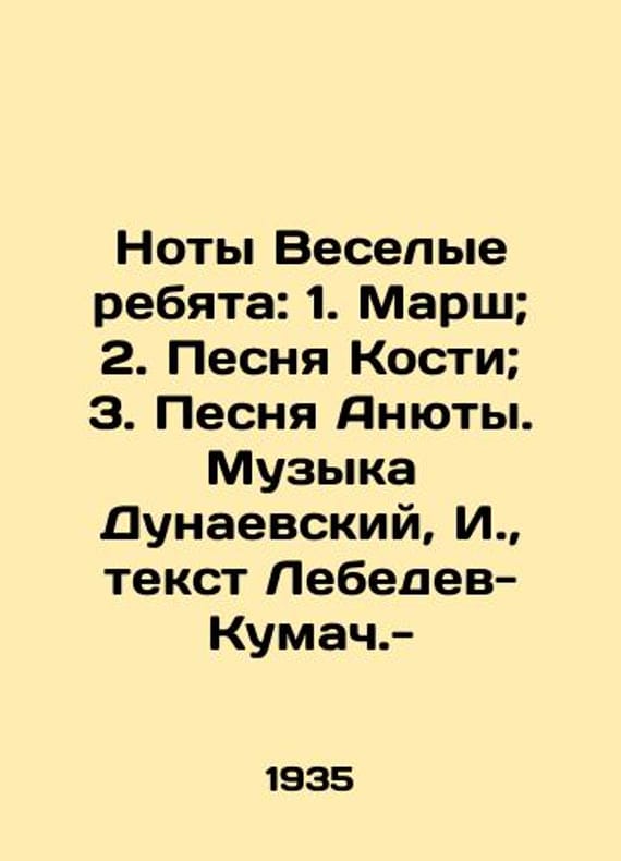 "Music by Veselye guys: 1. March; 2. Song of Kosti; 3. Song of Anyuta. Music by Dunaevsky, I., text by Lebedev-Kumach.-/Noty Veselye rebyata: 1. Marsh; 2. Pesnya Kosti; 3. Pesnya Anyuty. Muzyka Dunaevskiy, I., tekst Lebedev-Kumach.- Music by Veselye rebyy: 1. March; 2. Song of Kosti; 3. Song of Anyuta. Music by Dunaevsky, I., text by Lebedev-Kumach- 3rd ed. L.: Triton, 1935.-4 p. We have thousands of titles and often several copies of each title may be available. Please feel free to contact us for a detailed description of the copies available. SKUbd-5414bae0eccb6cae."