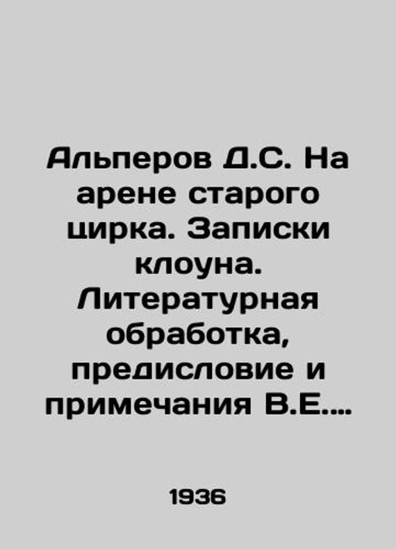 Alperov D.S. In the arena of the old circus. Notes by a clown. Literary processing, foreword and notes by V.E. Beklemisheva. Moscow. 1936. 401 p., 1 l./Alperov D.S. Na arene starogo tsirka. Zapiski klouna. Literaturnaya obrabotka, predislovie i primechaniya V.E. Beklemishevoy. Moskva. 1936 g. 401 s., 1 l. Alperov D.S. In the arena of the old circus. Notes by a clown. Literary processing, foreword and notes by V.E. Beklemisheva. Moscow. 1936. 401 p., 1 l.We have thousands of titles and often several copies of each title may be available. Please feel free to contact us for a detailed description of the copies available. SKUbd-56e0c462fc12273e.