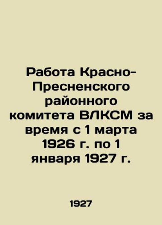 The Work of the Krasno-Presnensky District Committee of the All-Ukrainian Youth League for the Period from March 1, 1926 to January 1, 1927/Rabota Krasno-Presnenskogo rayonnogo komiteta VLKSM za vremya s 1 marta 1926 g. po 1 yanvarya 1927 g. The Work of the Krasno-Presnensky District Committee of the All-KSM for the Period from March 1, 1926 to January 1, 1927, Moscow: 1927.-57, 2.We have thousands of titles and often several copies of each title may be available. Please feel free to contact us for a detailed description of the copies available. SKUbd-56fe41bb08d5dedd.