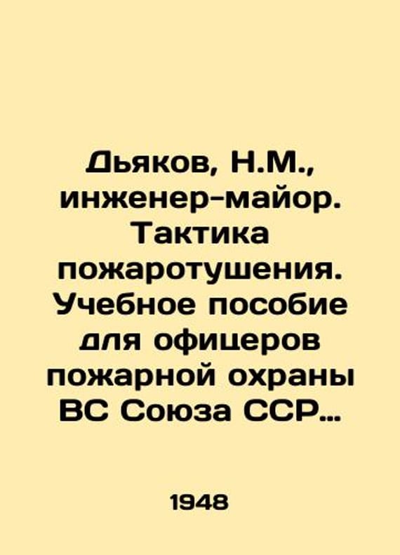 Dyakov, N.M., Major Engineer. Fire-fighting tactics. Training Manual for Officers of the Fire Brigade of the Armed Forces of the USSR, edited by M.N. Polosukhin./Dyakov, N.M., inzhener-mayor. Taktika pozharotusheniya. Uchebnoe posobie dlya ofitserov pozharnoy okhrany VS Soyuza SSR pod obshch. red. M.N. Polosukhina. Dyakov, N.M., Major Engineer. Fire-extinguishing tactics. Training Manual for Officers of the Fire Guard of the Armed Forces of the USSR, edited by M.N. Polosukhin. Moscow: Voenizdat, 1948. 208 p., il. We have thousands of titles and often several copies of each title may be available. Please feel free to contact us for a detailed description of the copies available. SKUbd-584cc7a3d8eb09fe.