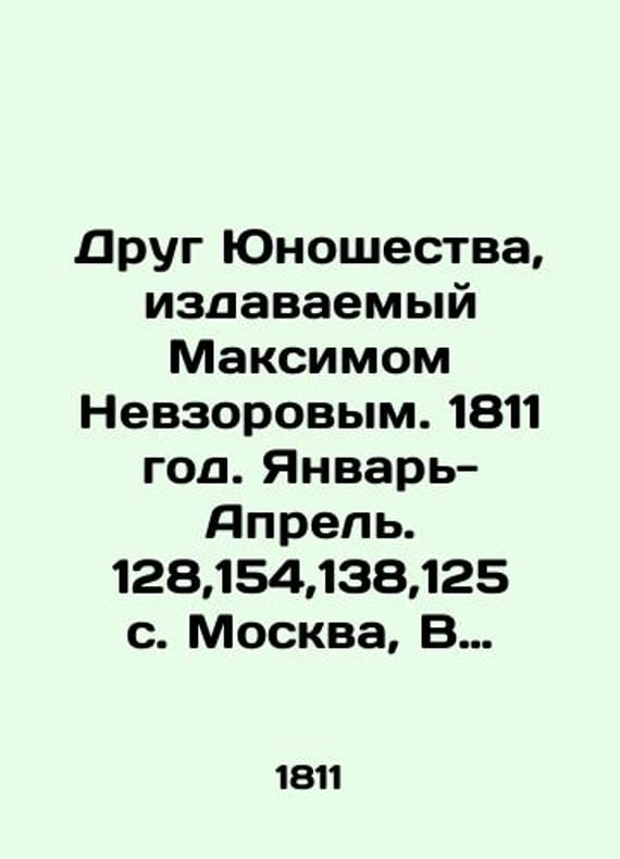 Friend of Youth, published by Maxim Nevzorov. 1811. January-April. 128,154,138,125 p. Moscow, In the university printing house. 21,5x13 sm./Drug Yunoshestva, izdavaemyy Maksimom Nevzorovym. 1811 god. Yanvar-Aprel. 128,154,138,125 c. Moskva, V universitetskoy tipografii. 21,5x13 sm. Friend of Youth, published by Maxim Nevzorov. 1811. January-April. 128,154,138,125 p. Moscow, In the university printing house. 21,5x13 sm.We have thousands of titles and often several copies of each title may be available. Please feel free to contact us for a detailed description of the copies available. SKUbd-598ab2e4db12c241.