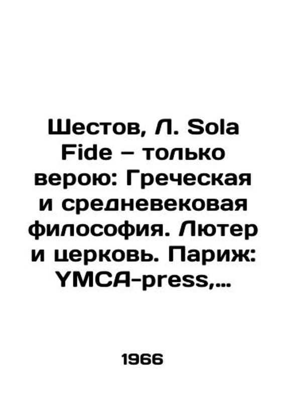 Sixth, L. Sola Fide: Greek and Medieval Philosophy, Luther and the Church. Paris: YMCA-press, 19/Shestov, L. Sola Fide tolko veroyu: Grecheskaya i srednevekovaya filosofiya. Lyuter i tserkov. Parizh: YMCA-press, 19 Sixth, L. Sola Fide: Greek and Medieval Philosophy. Luther and the Church. Paris: YMCA-press, 1966. 295, 1 p. 25 - 16.5 sm.. SKUbd-5c643f7690bbb765.We have thousands of titles and often several copies of each title may be available. Please feel free to contact us for a detailed description of the copies available. The delivery of this book might be delayed beyond the usual time due to extended processing and preparation before shipment, and faster shipping options are not offered. Please inform us if you need the order by a certain date or have a deadline.SKUbd-5c643f7690bbb765