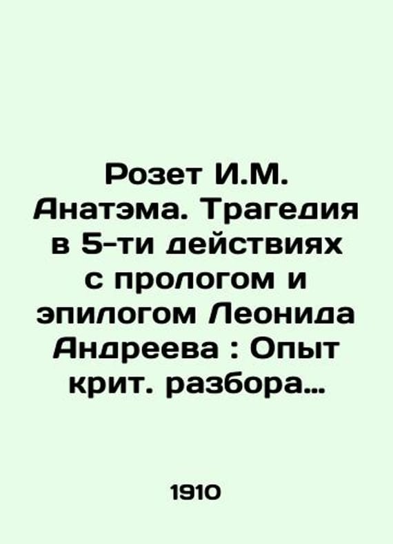 I. M. Anathams Rosette. Tragedy in 5 Acts with Leonid Andreevs Prologue and Epilogue: The Experience of I. M. Rosettes Crete Disparse Kyiv: Type. I. M. Rosette, 1910. 16 p./Rozet I.M. Anatema. Tragediya v 5-ti deystviyakh s prologom i epilogom Leonida Andreeva : Opyt krit. razbora I.M. Rozeta Kiev : tip. I.M. Rozeta, 1910. 16 s. I. M. Anathams Rosette. Tragedy in 5 Acts with Leonid Andreevs Prologue and Epilogue: The Experience of I. M. Rosettes Crete Disparse Kyiv: Type. I. M. Rosette, 1910. 16 SKUbd-5ce8d7f795b0023b.We have thousands of titles and often several copies of each title may be available. Please feel free to contact us for a detailed description of the copies available. The delivery of this book might be delayed beyond the usual time due to extended processing and preparation before shipment, and faster shipping options are not offered. Please inform us if you need the order by a certain date or have a deadline.SKUbd-5ce8d7f795b0023b