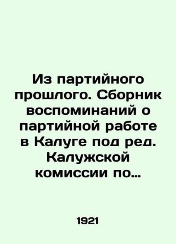 From the Party Past. A collection of memoirs about party work in Kaluga, edited by the Kaluga Commission on the History of the October Revolution and R.K. In Issue 2, Volume 1. Kaluga: State Publishing House, 19/Iz partiynogo proshlogo. Sbornik vospominaniy o partiynoy rabote v Kaluge pod red. Kaluzhskoy komissii po istorii Oktyabrskoy revolyutsii i R.K. V 2 vyp. Vyp. 1. Kaluga: Gos. Izdatelstvo, 19 From the Party Past. A collection of memoirs about the Partys work in Kaluga, edited by the Kaluga Commission on the History of the October Revolution and R.K. In the second volume, Volume 1. Kaluga: State Publishing House, 1921. 364, 2, II p., 17 l.We have thousands of titles and often several copies of each title may be available. Please feel free to contact us for a detailed description of the copies available. SKUbd-5d1a88c94f9514a0.