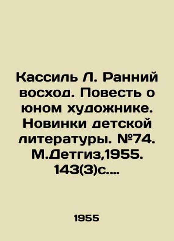 Kassil L. Early Sunrise. A Tale of a Young Artist. Novelties in Childrens Literature. # 74. M.Detgiz, 1955. 143 (3) p. 15l. 25,8x20,5 sm./Kassil L. Ranniy voskhod. Povest o yunom khudozhnike. Novinki detskoy literatury. #74. M.Detgiz,1955. 143(3)s. 15l. 25,8x20,5 sm. Kassil L. Early Sunrise. A Tale of a Young Artist. Novelties in Childrens Literature. # 74. M.Detgiz, 1955. 143 (3) p. 15l. 25,8x20,5 sm.We have thousands of titles and often several copies of each title may be available. Please feel free to contact us for a detailed description of the copies available. SKUbd-5d9db04a4209f31a.