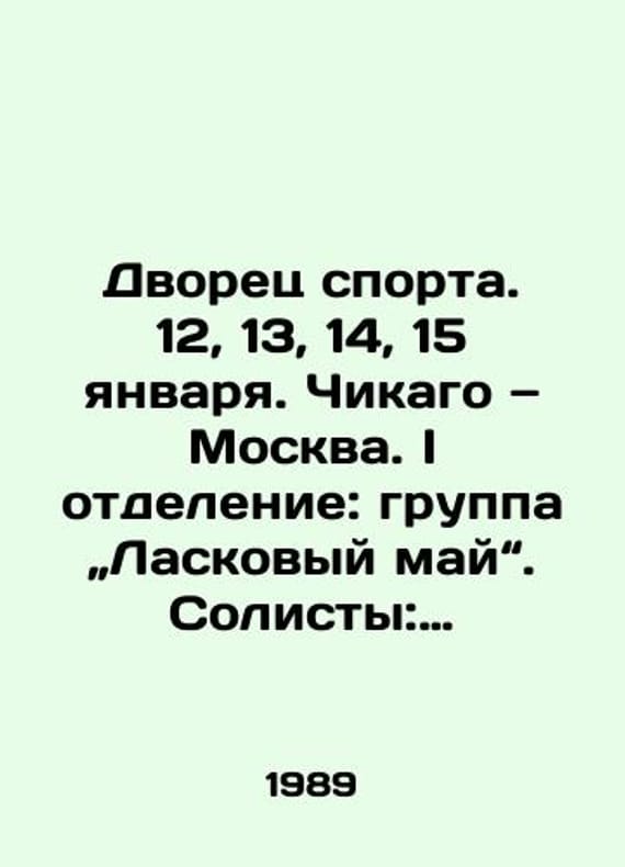 Palace of Sports. January 12, 13, 14, 15. Chicago, Moscow. I section: band Laskovy May. Soloists: Konstantin Pakhomov, Andrei Razin, Yuri Shatunov. II section: rock band Rock house (USA)./Dvorets sporta. 12, 13, 14, 15 yanvarya. Chikago Moskva. I otdelenie: gruppa Laskovyy may. Solisty: Konstantin Pakhomov, Andrey Razin, Yuriy Shatunov. II otdelenie: rok-gruppa Rok-khauz (SShA). Palace of Sports. January 12, 13, 14, 15. Chicago, Moscow. I section: group Laskovy May. Soloists: Konstantin Pakhomov, Andrei Razin, Yuri Shatunov. II section: rock band Rock House (USA). We have thousands of titles and often several copies of each title may be available. Please feel free to contact us for a detailed description of the copies available. SKUbd-5ddba26c3e21bbc0.