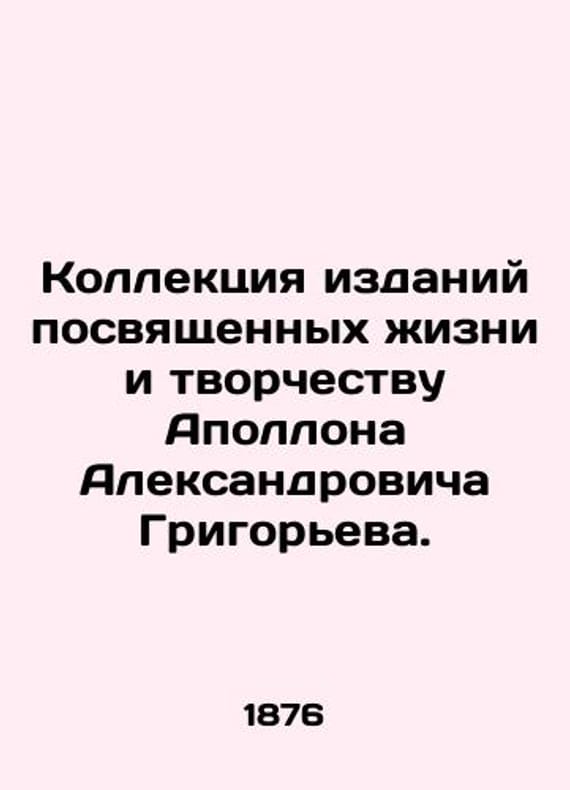 A collection of publications devoted to the life and work of Apollo Alexandrovich Grigoriev./Kollektsiya izdaniy posvyashchennykh zhizni i tvorchestvu Apollona Aleksandrovicha Grigoreva. 1876-1922. 1. Works by Apollo Grigoriev. St. Petersburg, 1876. 2. Mikhailov D. Apollo Grigorievs life in connection with the character of his literary activities. St. Petersburg, 1900. V.Savodnik. Apollo Grigorievs biography Moscow, 1915. 4. Collection of works by Apollo Grigoriev, edited by V.F. Savodnik. Issue 1-14. Moscow-Petrograd-Kazan, 1915-1916. 5. Apollo Alexandrovich Grigoriev. Materials for biography, edited by Vlad.Knyazhnin. Publication of the Pushkin House at the Academy of Sciences. Petrograd, 1917. 6. Apollo Grigoriev in memory of the centennial of his birth 1822-1922. Pushkinsky House, Petersburg, 1922.We have thousands of titles and often several copies of each title may be available. Please feel free to contact us for a detailed description of the copies available. SKUbd-5ddd975a0149db90.