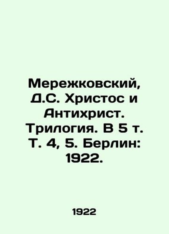 Merezhkovsky, D.S. Christ and the Antichrist. Trilogy. In 5 Vol. 4, 5. Berlin: 1922./Merezhkovskiy, D.S. Khristos i Antikhrist. Trilogiya. V 5 t. T. 4, 5. Berlin: 1922. Vol. 4: The Antichrist. Peter and Alexei. Vol. 1, 356, 2 p. Vol. 5: The Antichrist. Peter and Alexei. Vol. 2, 369, 1 We have thousands of titles and often several copies of each title may be available. Please feel free to contact us for a detailed description of the copies available. SKUbd-5f6667fda92358df.