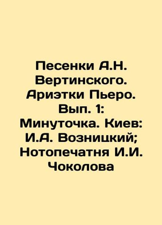 "Songs by A.N. Vertinsky. Pieros Arietki. Volume 1: Minute-by-Minute. Kyiv: I.A. Voznitsky; Notophynya I.I. Chokolov/Pesenki A.N. Vertinskogo. Arietki Pero. Vyp. 1: Minutochka. Kiev: I.A. Voznitskiy; Notopechatnya I.I. Chokolova Songs by A.N. Vertinsky. Pieros Arietki. Volume 1: Minute-by-Minute. Kyiv: I.A. Voznitsky; Notophynya I.I. Chokolov. We have thousands of titles and often several copies of each title may be available. Please feel free to contact us for a detailed description of the copies available. SKUbd-605463e6d581d63f."