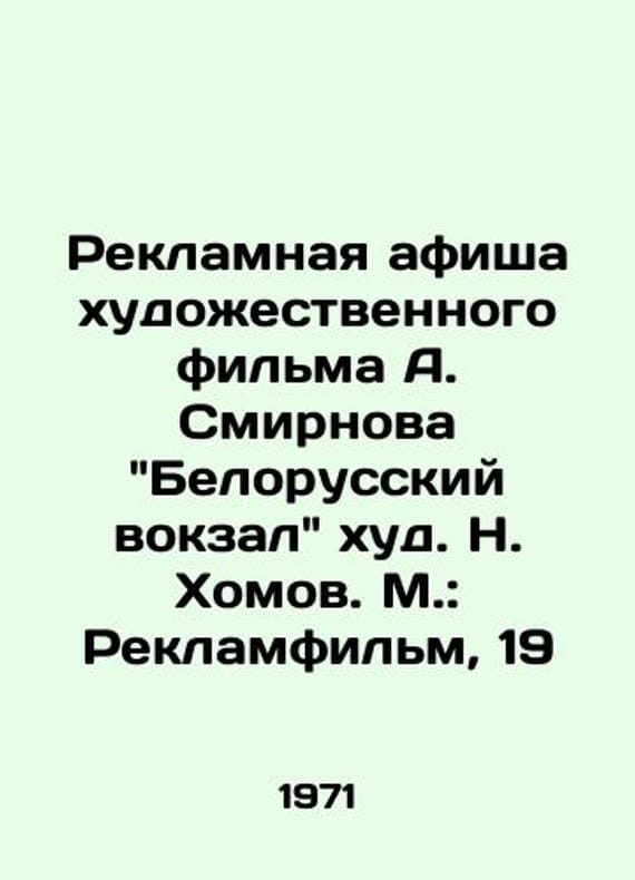 Advertising poster for A. Smirnovs feature film Belorussky Railway Station by N. Khomov. Moscow: Advertising film, 19/Reklamnaya afisha khudozhestvennogo filma A. Smirnova Belorusskiy vokzal khud. N. Khomov. M.: Reklamfilm, 19 Advertising poster for A. Smirnovs feature film Belorussky Railway Station, directed by N. Khomov. Moscow: Advertising film, 1971. 65 - 42 sm.We have thousands of titles and often several copies of each title may be available. Please feel free to contact us for a detailed description of the copies available. The delivery of this book might be delayed beyond the usual timeframe due to extended processing and preparation before shipment, and faster shipping options are not offered. Please inform us if you need the order by a certain date or have a deadline.SKUbd-6175e46dd0fe56c1
