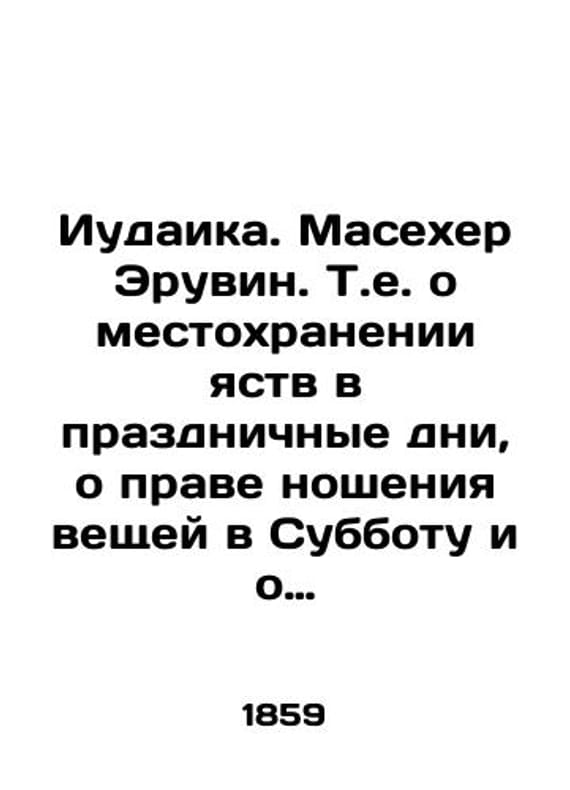 Judaism. Masecher Eruvin. That is, about the place of eating on the holidays, about the right to carry things on the Sabbath, and about walking at a fraction of the cost. Part I., II., III (in one book)/Iudaika. Masekher Eruvin. T.e. o mestokhranenii yastv v prazdnichnye dni, o prave nosheniya veshchey v Subbotu i o khozhdenii za neznachitelnuyu chertu. Ch. I., II., III (v odnoy knige). V tipografii R.M. Romma. Vilno 1859g., 348str. Judaism. Masecher Eruvin. That is, about the place of eating on the holidays, about the right to carry things on the Sabbath, and about walking at a fraction of the cost. Part I., II., III (in one book). We have thousands of titles and often several copies of each title may be available. Please feel free to contact us for a detailed description of the copies available. SKUbd-62183afeec2a1238.
