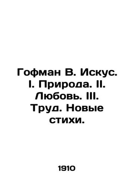 Hoffman V. Art. I. Nature. II. Love. III. Labor. New Verses./Gofman V. Iskus. I. Priroda. II. Lyubov. III. Trud. Novye stikhi. Hoffman V. Art. I. Nature. II. Love. III. Labor. New Verses. St. Petersburg: T-Vo M.O. Wolf, 1910. 4, 97, 3 We have thousands of titles and often several copies of each title may be available. Please feel free to contact us for a detailed description of the copies available. SKUbd-6294efcf60d15fed.