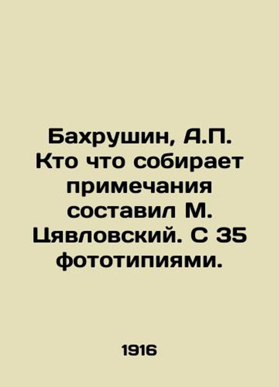 "Bahrushin, A. Who collects what notes was compiled by M. Tsyavlovsky. With 35 phototypes./Bakhrushin, A. Kto chto sobiraet primechaniya sostavil M. Tsyavlovskiy. S 35 fototipiyami. Bakhrushin, A. From A. Bakhrushins notebook. Who collects what notes was compiled by M. Tsyavlovsky. With 35 phototypes. Moscow: Published by L.E. Bukhheim; Tipo-lit. T-va I.N. Kushnerev and Ko, 1916. 2, 168, 2 p., 35 l. 23.3 - 16.2 sm.We have thousands of titles and often several copies of each title may be available. Please feel free to contact us for a detailed description of the copies available. SKUbd-64d2495829e2398e."
