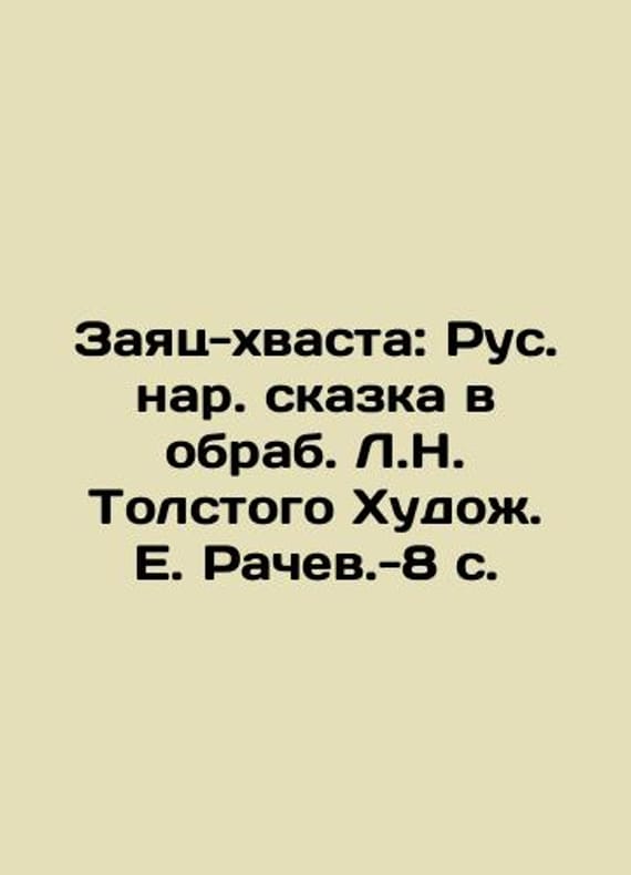 Hare-braggadocio: Russian fairy tale in the reproduction of L.N. Tolstoy by Artist E. Rachev-8 p./Zayats-khvasta: Rus. nar. skazka v obrab. L.N. Tolstogo Khudozh. E. Rachev.-8 s. (illustrations-E.Rachov) Hare-braggadocio: Russian folk tale in the reproduction of L.N. Tolstoy by Khodzh E. Rachev-8 We have thousands of titles and often several copies of each title may be available. Please feel free to contact us for a detailed description of the copies available. SKUbd-65f08276e3edd16e.