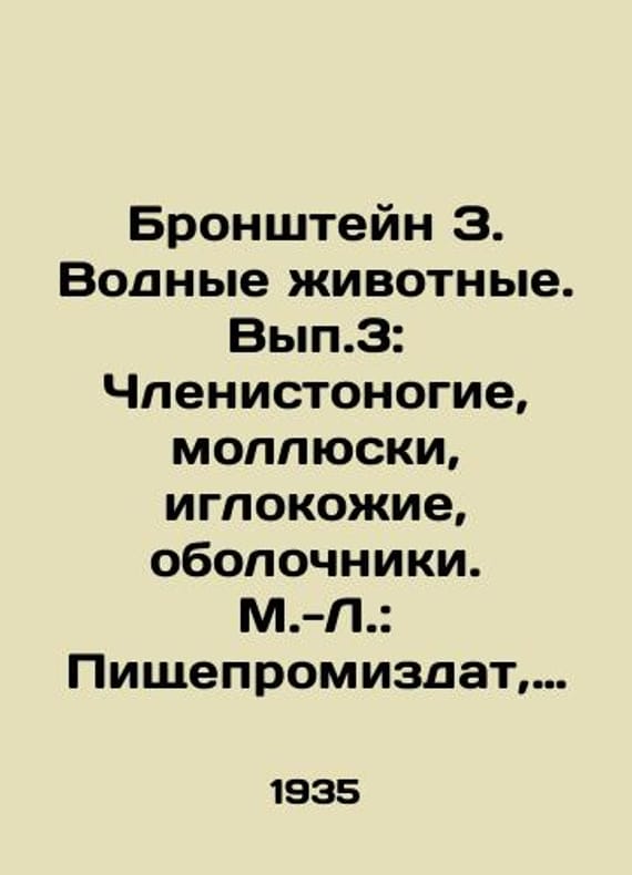 Bronstein Z. Aquatic animals. Vol.3: Arthropods, shellfish, needles, shell/Bronshteyn Z. Vodnye zhivotnye. Vyp.3: Chlenistonogie, mollyuski, iglokozhie, obolochniki. M.-L.: Pishchepromizdat, 1935. Bronstein Z. Aquatic animals. Vol.3: Arthropods, shellfish, needles, shell. We have thousands of titles and often several copies of each title may be available. Please feel free to contact us for a detailed description of the copies available. SKUbd-65fe51487e690cab.
