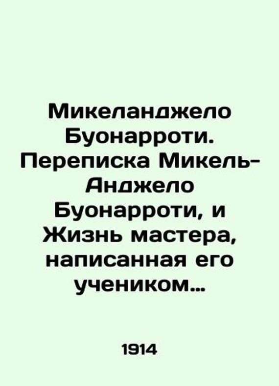 Michelangelo Buonarroti: The Correspondence of Michelo-Angelo Buonarroti and the Life of the Master, written by his disciple Ascanio Condivi./Mikelandzhelo Buonarroti. Perepiska Mikel-Andzhelo Buonarroti, i Zhizn mastera, napisannaya ego uchenikom Askanio Kondivi. Michelangelo Buonarroti. Correspondence by Michelo-Angelo Buonarroti, and the Life of the Master, written by his disciple Ascanio Condivi. With the attachment of a portrait and twenty drawings by M. Pavlinova. St. Petersburg: Rosewood, 1914. 6, 238 p.:. We have thousands of titles and often several copies of each title may be available. Please feel free to contact us for a detailed description of the copies available. SKUbd-66e9f62a77f97514.
