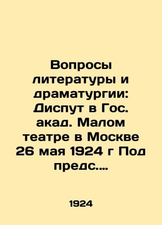 "Questions of Literature and Drama: Dispute at the State Academic Maly Theatre in Moscow on May 26, 1924, under the auspices of A.V.Lunacharsky; With the participation of: N.Sakulin and others./Voprosy literatury i dramaturgii: Disput v Gos. akad. Malom teatre v Moskve 26 maya 1924 g Pod preds. A.V.Lunacharskogo; Pri uchastii: N.Sakulina i dr.- Questions of Literature and Drama: Dispute at the State Academic Maly Theatre in Moscow on May 26, 1924, under the auspices of A.V.Lunacharsky; With the participation of: N.Sakulin and d.-L.: Ros. We have thousands of titles and often several copies of each title may be available. Please feel free to contact us for a detailed description of the copies available. SKUbd-67e3dd7de8490160."