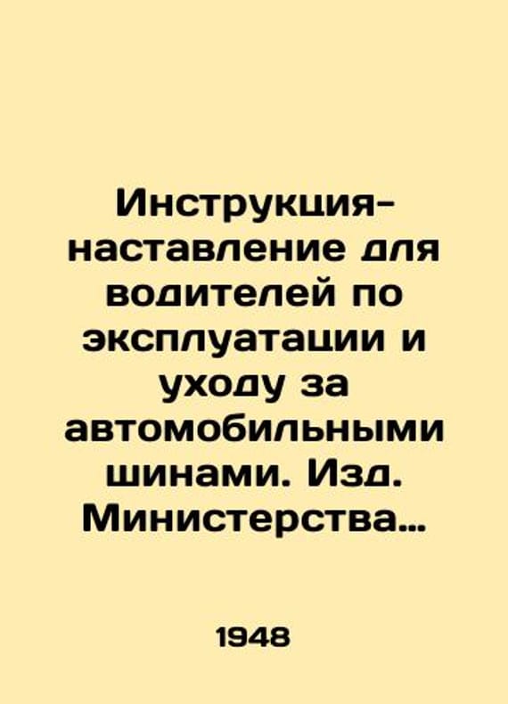 Instructions for drivers on the operation and maintenance of car tires. Publishing House of the Ministry of Public Utilities of the RSFSR. 1948/Instruktsiya-nastavlenie dlya voditeley po ekspluatatsii i ukhodu za avtomobilnymi shinami. Izd. Ministerstva kommunalnogo khozyaystva RSFSR. 1948 g. Instructions for drivers on the operation and maintenance of car tires. Publishing House of the Ministry of Public Utilities of the RSFSR. 1948.We have thousands of titles and often several copies of each title may be available. Please feel free to contact us for a detailed description of the copies available. SKUbd-688c5265583f0a5.