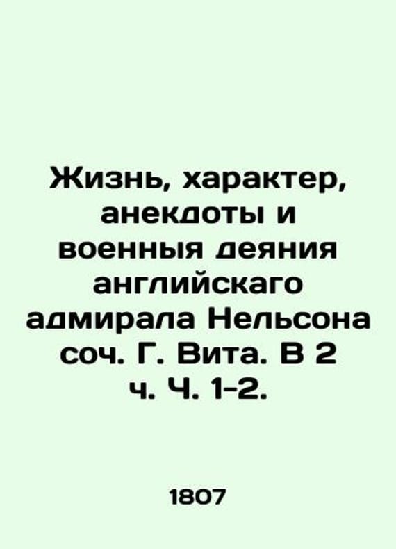 The Life, Character, Jokes, and Military Acts of the English Admiral Nelson, Op. G. Vit. In 2h pp. 1-2./Zhizn, kharakter, anekdoty i voennyya deyaniya angliyskago admirala Nelsona soch. G. Vita. V 2 ch. Ch. 1-2. The Life, Character, Jokes, and Military Acts of the English Admiral Nelson, Op. G. Vit. In 2 Parts 1-2. Moscow: In Type Kryazhev and May, 1807. Part 1: 106 p. We have thousands of titles and often several copies of each title may be available. Please feel free to contact us for a detailed description of the copies available. SKUbd-6917b0c249665e2.