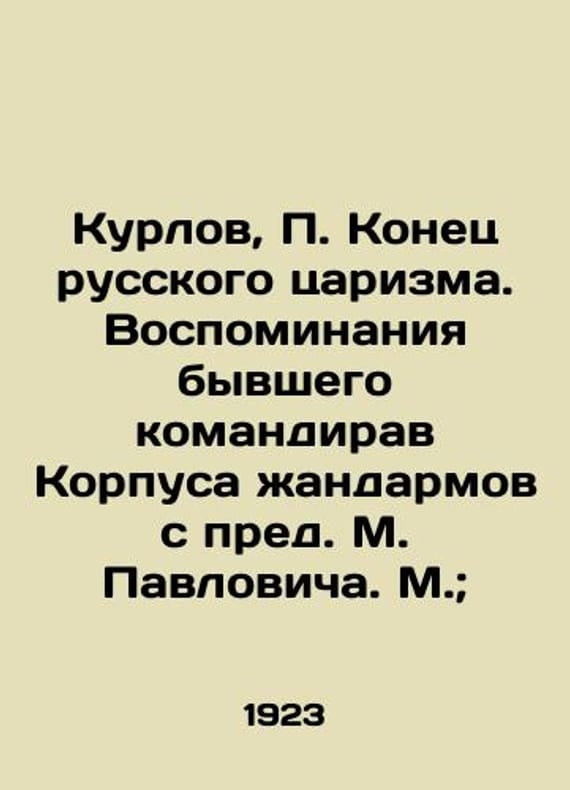 "Kurlov, The End of Russian Tsarism. Reminiscences of a Former Commander of the Gendarmerie Corps by M. Pavlovich. M.;/Kurlov, Konets russkogo tsarizma. Vospominaniya byvshego komandirav Korpusa zhandarmov s pred. M. Pavlovicha. M.; Kurlov, The End of Russian Tsarism. Memoirs of a former commander of the Gendarmerie Corps from M. Pavlovichs perspective. Moscow; Pg.: GIZ, 1923. We have thousands of titles and often several copies of each title may be available. Please feel free to contact us for a detailed description of the copies available. SKUbd-69c83a3060093df4."