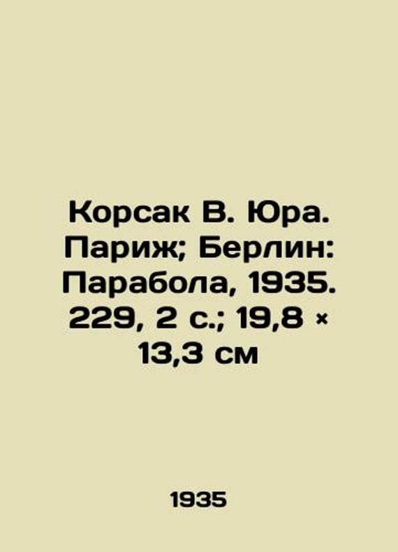 "Korsak V. Jura. Paris; Berlin: Parabola, 1935. 229, 2 p.; 19.8 - 13.3 cm/Korsak V. Yura. Parizh; Berlin: Parabola, 1935. 229, 2 s.; 19,8 - 13,3 sm Korsak V. Jura. Paris; Berlin: Parabola, 1935. 229, 2 p.;. We have thousands of titles and often several copies of each title may be available. Please feel free to contact us for a detailed description of the copies available. SKUbd-6cfd88f9372a87d0."