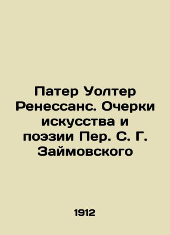 Pater Walter Renaissance. Essays on Art and Poetry by Per S. G. Zaimovsky/Pater Uolter Renessans. Ocherki iskusstva i poezii Per. S. G. Zaymovskogo Pater Walter Renaissance: Essays on Art and Poetry by Per S. G. Zaimovsky from the 5th English edition of Moscow: Problems of Aesthetics, 1912. We have thousands of titles and often several copies of each title may be available. Please feel free to contact us for a detailed description of the copies available. The delivery of this book might be delayed beyond the usual timeframe due to extended processing and preparation before shipment, and faster shipping options are not offered. Please inform us if you need the order by a certain date or have a deadline.SKUbd-6de7d68c92e82584