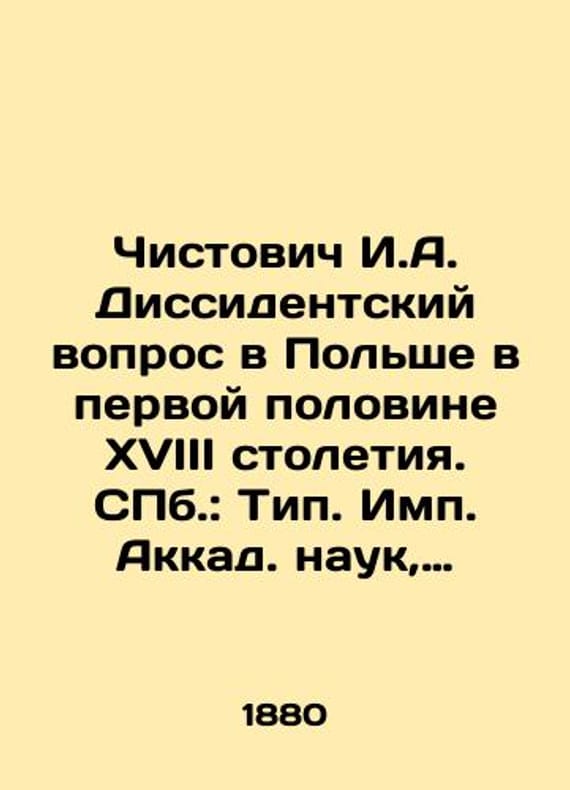 Chistowicz I.A. The Dissident Question in Poland in the First Half of the XVIII Century. St. Petersburg: Type. Imp. Acad. sciences, 1880./Chistovich I.A. Dissidentskiy vopros v Polshe v pervoy polovine XVIII stoletiya. ill.: Tip. Imp. Akkad. nauk, 1880. Chistowicz I.A. The Dissident Question in Poland in the First Half of the XVIII Century. Appendix to Volume XXXVII of the Memorandum of the Imperial Academy of Sciences. # 6. St. Petersburg: Type of Imp. Accident Sciences, 1880-82 p. We have thousands of titles and often several copies of each title may be available. Please feel free to contact us for a detailed description of the copies available. SKUbd-6e9656f5a44d7262.