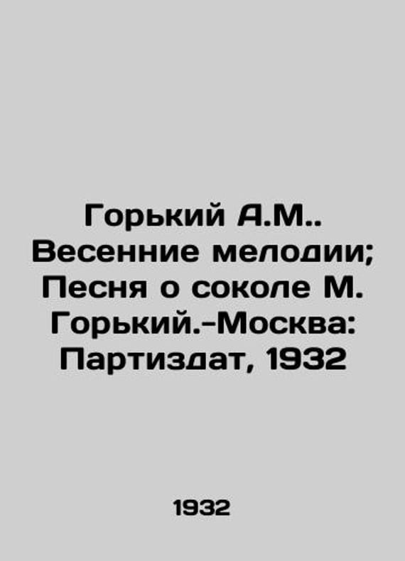 "Gorky A.M. Spring melodies; Song about Falcon M. Gorkiy.-Moscow: Partizdat, 1932/Gorkiy A.M. Vesennie melodii; Pesnya o sokole M. Gorkiy.-Moskva: Partizdat, 1932 Gorky A.M. Spring melodies; A Song About a Falcon by M. Gorkiy.-Moscow: Partizdat, 1932.-The Region, 22, 2 p.:. We have thousands of titles and often several copies of each title may be available. Please feel free to contact us for a detailed description of the copies available. SKUbd-6eed7cb76e50c7ad."