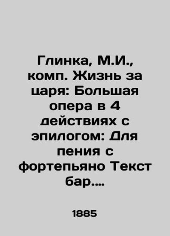 "Glinka, M.I., Comp. Life for the Tsar: Grand Opera in 4 acts with epilogue: For singing from the piano Text bar. Rosen./Glinka, M.I., komp. Zhizn za tsarya: Bolshaya opera v 4 deystviyakh s epilogom: Dlya peniya s fortepyano Tekst bar. Rozena. Glinka, M.I., Comp. Life for the Tsar: Grand Opera in 4 Acts with Epilogue: For singing from the piano Text bar. Rosen. Moscow: A. Gutheil, 1885.-387 p.: sheet music; 26.4x18.6 sm. We have thousands of titles and often several copies of each title may be available. Please feel free to contact us for a detailed description of the copies available. SKUbd-704522407ff04657."