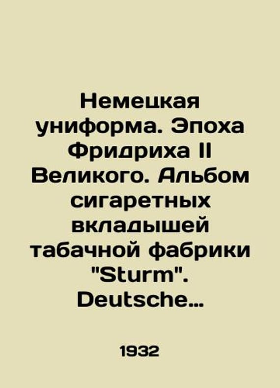 The German Uniform. The Age of Friedrich II the Great. An album of cigarette liners from the Sturm tobacco factory. Deutsche uniformen. Dresden: Sturm zigaretten, 1932./Nemetskaya uniforma. Epokha Fridrikha II Velikogo. Albom sigaretnykh vkladyshey tabachnoy fabriki Sturm. Deutsche uniformen. Dresden: Sturm zigaretten, 1932. The German Uniform. The Age of Friedrich II the Great. An album of cigarette liners from the Sturm tobacco factory. Deutsche uniformen. Dresden: Sturm zigaretten, 1932.We have thousands of titles and often several copies of each title may be available. Please feel free to contact us for a detailed description of the copies available. SKUbd-707c51a57c4a3441.