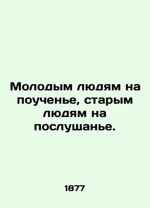 Young people to learn, old people to listen./Molodym lyudyam na pouchene, starym lyudyam na poslushane. Young people to be taught, old people to be obedient. Bee: Collected for drug reading and consumption by Nikolai Shcherbina.-5th ed. -St. Petersburg: Type I.I. Glazunov, 1877.-4, X, 651, 7 p., 1 l. We have thousands of titles and often several copies of each title may be available. Please feel free to contact us for a detailed description of the copies available. SKUbd-70edd0d032fff88c.