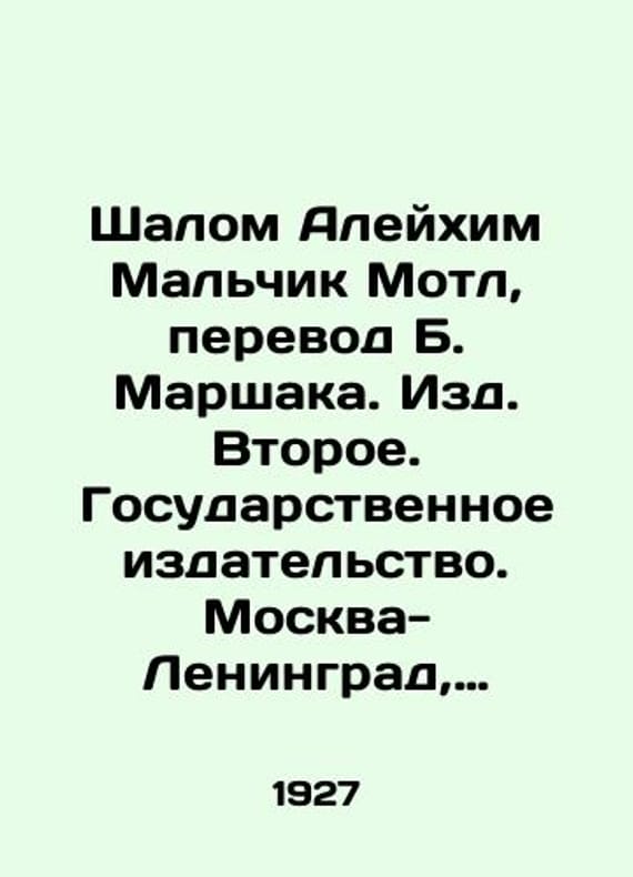 Shalom Aleichim Malchik Motl, translated by B. Marshak. Second edition. State Publishing House. Moscow-Leningrad, 1927, 256 pages./Shalom Aleykhim Malchik Motl, perevod B. Marshaka. Izd. Vtoroe. Gosudarstvennoe izdatelstvo. Moskva-Leningrad, 1927g., 256str. Shalom Aleichim Malchik Motl, translated by B. Marshak. Second edition. State Publishing House. Moscow-Leningrad, 1927, 256 pages. We have thousands of titles and often several copies of each title may be available. Please feel free to contact us for a detailed description of the copies available. SKUbd-7155687ad312c2e8.