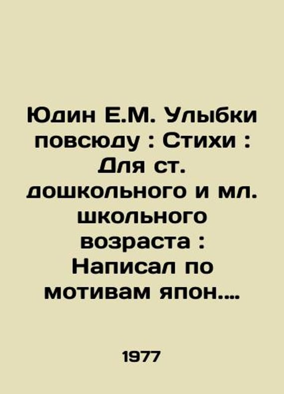 Yudin E.M. Smiles Everywhere: Poems: For preschool and junior school age: Written on the basis of Japanese folklore by Efim Yudin, Ric. B. Vlasov-Leningrad: Det. lit. Leningrad, 1977. 18, 2 p./Yudin E.M. Ulybki povsyudu: Stikhi: Dlya st. doshkolnogo i ml. shkolnogo vozrasta: Napisal po motivam yapon. folklora Efim Yudin Ris. B. Vlasova.-Leningrad: Det. lit. Leningr. otd-nie, 1977. 18, 2 s. (illustrations-B.Vlasov) Yudin E.M. Smiles Everywhere: Poems: For preschool and junior school age: Written on the basis of Japanese folklore by Efim Yudin Ric. B. Vlasov-Leningrad: Det. lit. Leningrad branch, 1977. We have thousands of titles and often several copies of each title may be available. Please feel free to contact us for a detailed description of the copies available. SKUbd-715c75527de13230.